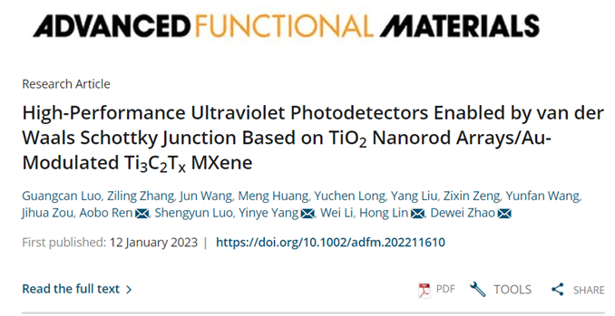 近日,我院青年教师罗光灿博士作为第一作者,贵州民族大学作为第一单位,在国际著名学术期刊《先进功能材料》(Advanced Functional Materials,IF: 19.924)发表题为《High-performance ultraviolet photodetectors enabled by van der Waals Schottky junction based on TiO2 nanorod arrays/Au-modulated Ti3C2Tx MXene》(基于TiO2纳米棒阵列/金调制Ti3C2Tx MXene范德华肖特基结的高性能紫外光电探测器)的学术研究论文。